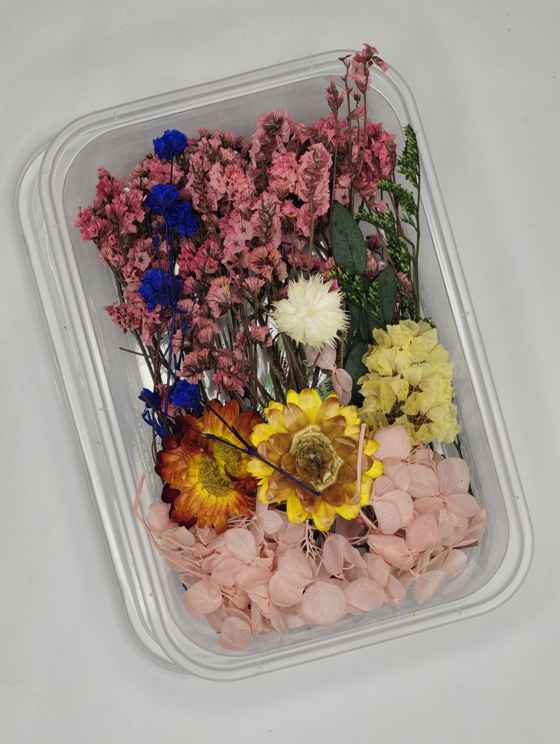A charming collection of naturally dried florals arranged in a soft, romantic palette. This box features delicate pink statice, pastel hydrangea petals, vibrant blue accents, and warm-toned sunflower heads, creating a beautiful contrast of textures and colors. Perfect for DIY crafts, resin art, candle decoration, or home décor, this curated mix brings the essence of a blooming meadow into your creative projects with long-lasting elegance.✨
