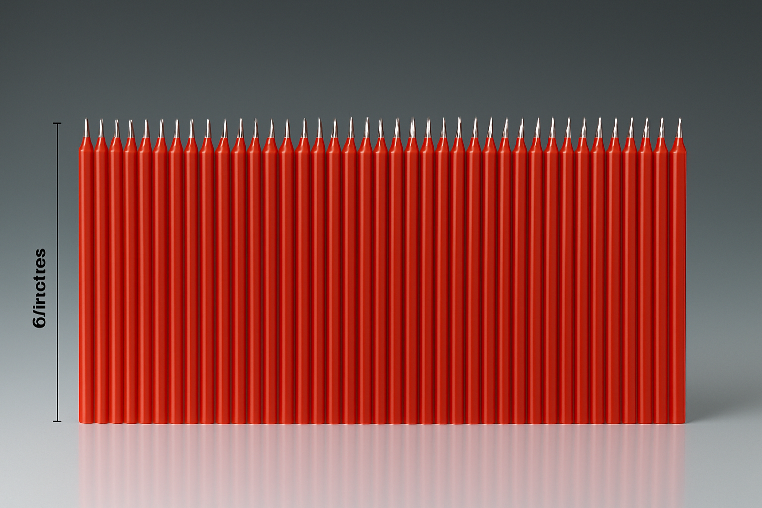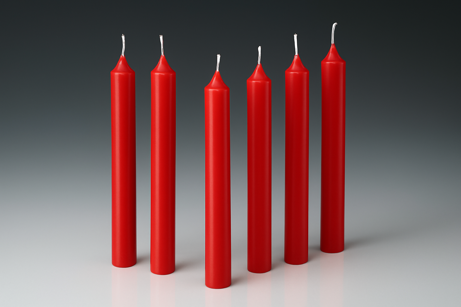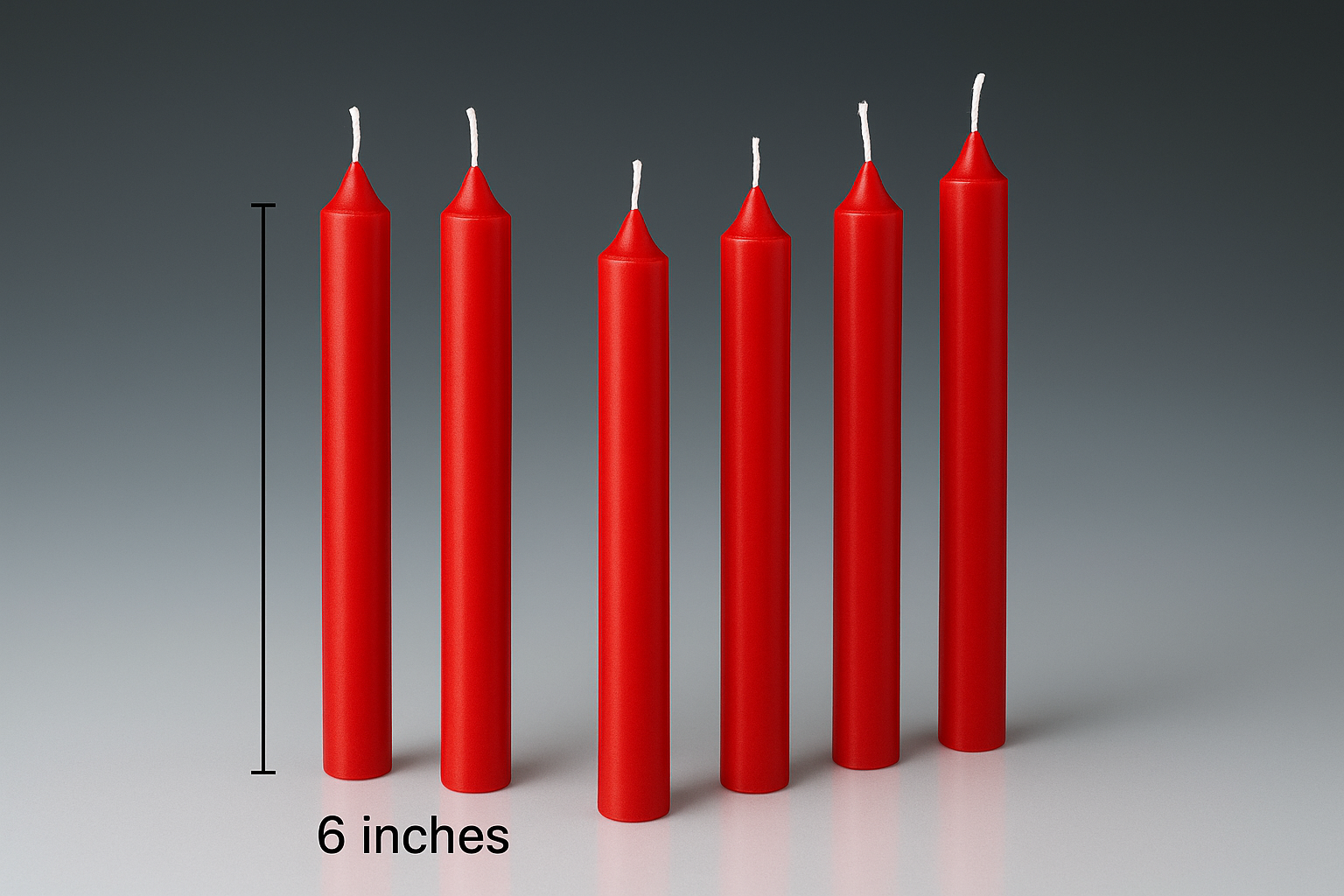 The image shows tall red taper candles standing upright in a neat row. Each candle is smooth, glossy, and cylindrical with a pointed top and a white wick. All six candles are evenly spaced and identical in shape, size, and color. On the left side of the image, a vertical black measurement line is displayed, and below it the text “6 inches” clearly indicates the height of the candles. The background features a clean gradient from dark grey to light grey, giving the scene a professional, studio-like appearance. The candles rest on a smooth, reflective surface that enhances the overall polished and elegant look of the image.