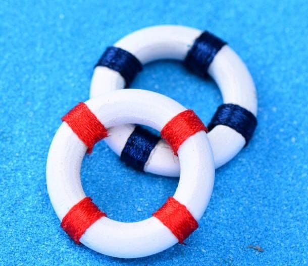 A pair of charming miniature lifebuoy rings designed with a classic nautical theme. Featuring white bases wrapped with red and navy thread accents, these tiny decorations are perfect for marine-inspired crafts, dollhouses, or beach-themed displays.